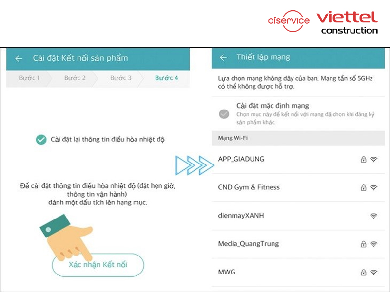 Bước 3: Sau đó bạn quay trở lại ứng dụng LG SmartThinQ, vào mục Cài đặt Kết nối sản phẩm và chọn Xác nhận kết nối.Lựa chọn wifi của gia đình bạn đang dùng để kết nối.