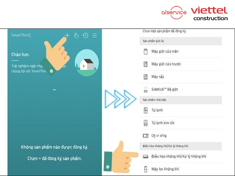 Bước 3: Ấn vào dấu + phía trên góc phải màn hình để đăng ký sản phẩm điều hòa LG đang sử dụng. Tiếp theo hãy chọn mục Điều hòa không khí/Xử lý không khí như hình minh họa bên dưới.